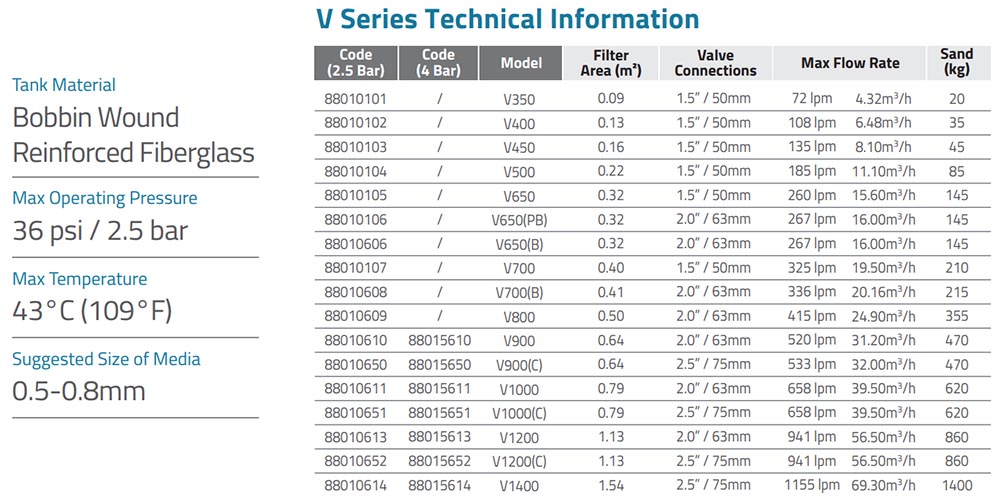 2. Thông số kỹ thuật Bình lọc cát bể bơi Emaux V1000