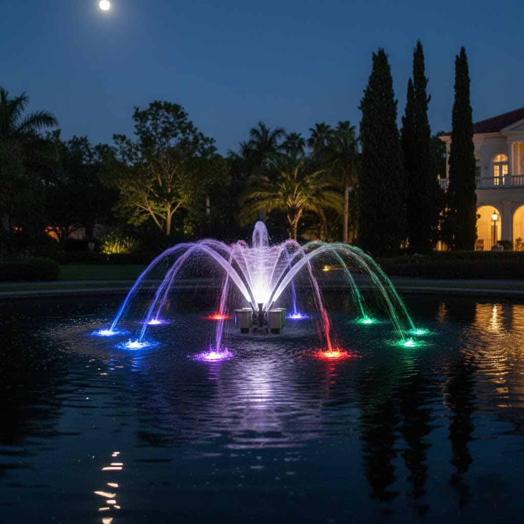 Ánh sáng: Lắp đặt thêm đèn LED âm nước tại chân mỗi vòi phun để tạo hiệu ứng bông hoa rực rỡ sắc màu vào ban đêm.