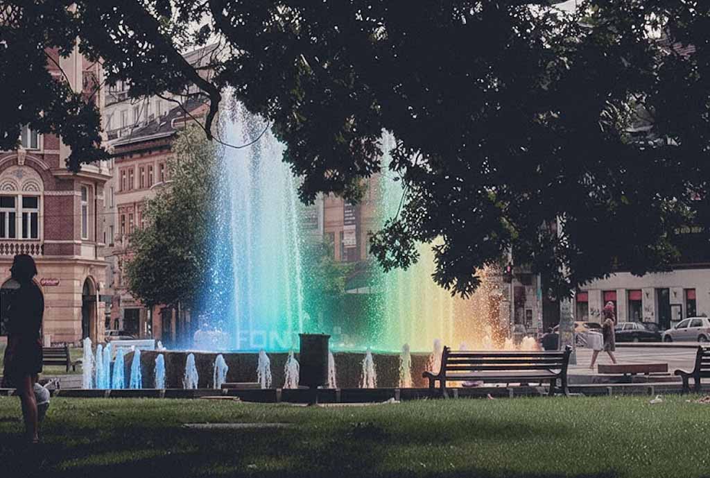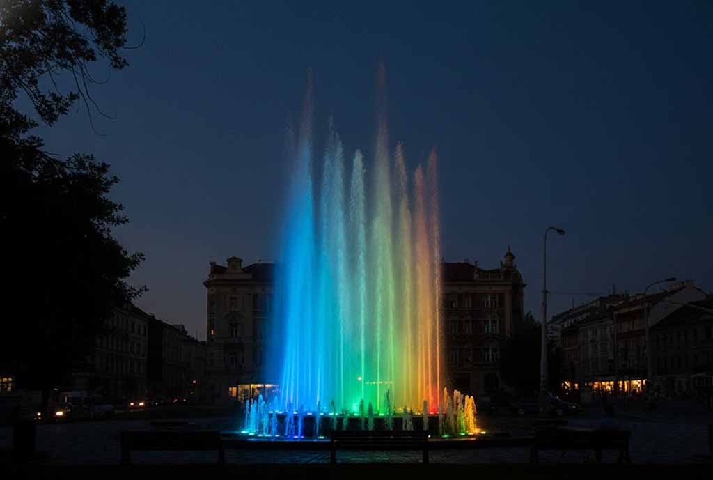 Sự kết hợp hoàn hảo: Vòi phun HDN-AE và đèn LED tạo nên một sân khấu ánh sáng sống động, biến đài phun nước thành tâm điểm thu hút mọi ánh nhìn.